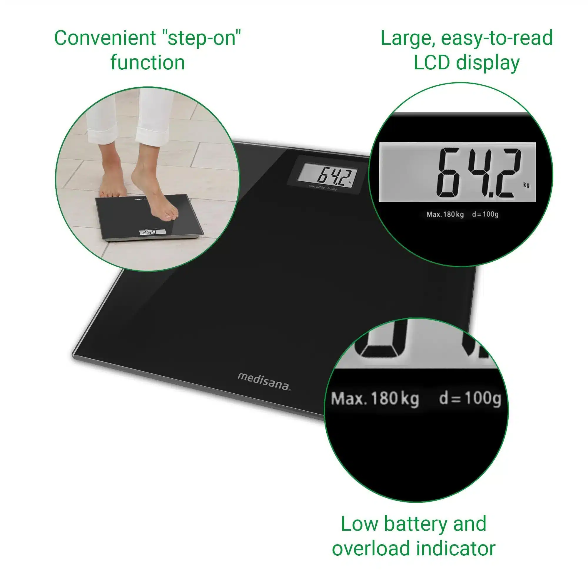Automatic On/Off: Begins measuring as soon as you step on the scale and turns off automatically to save battery.