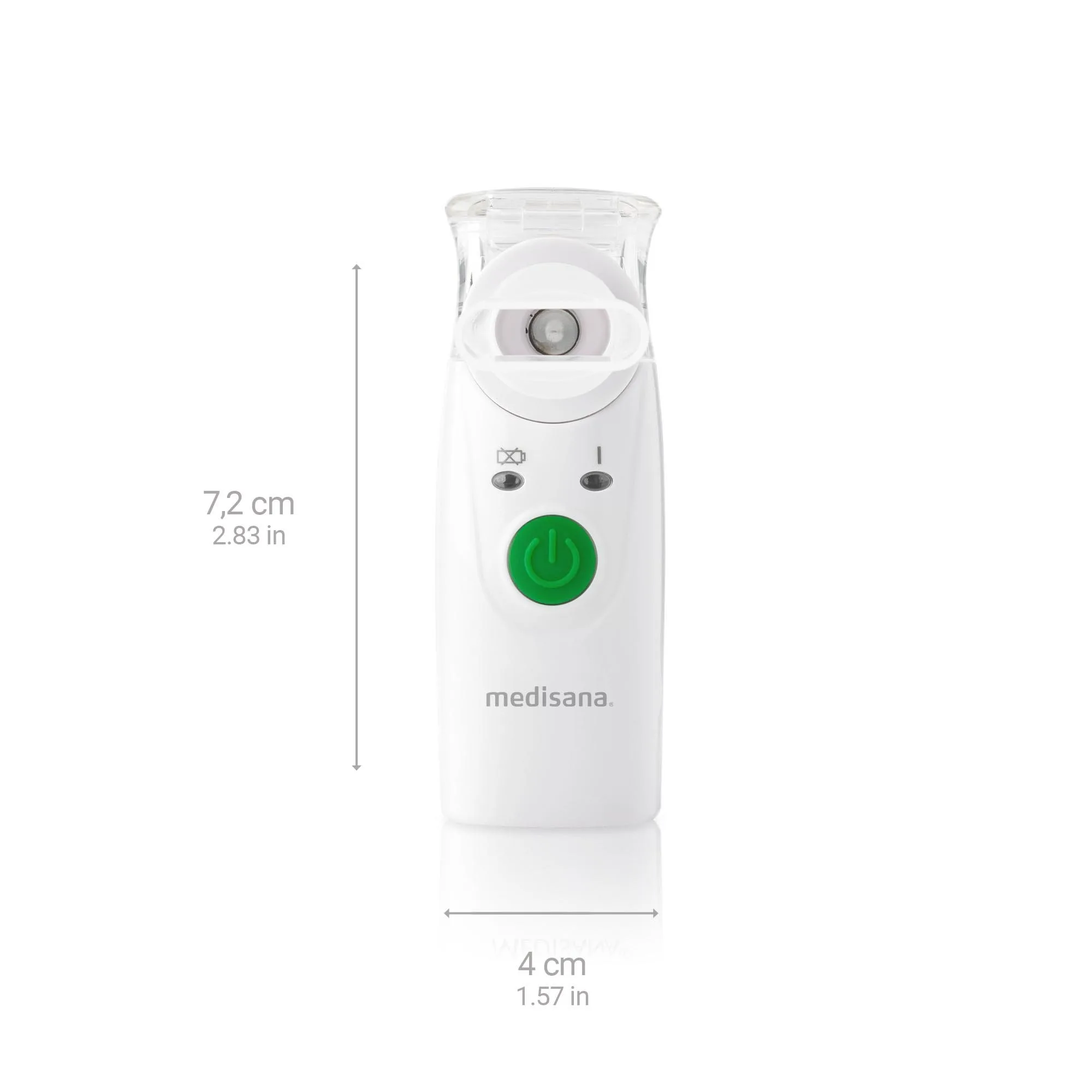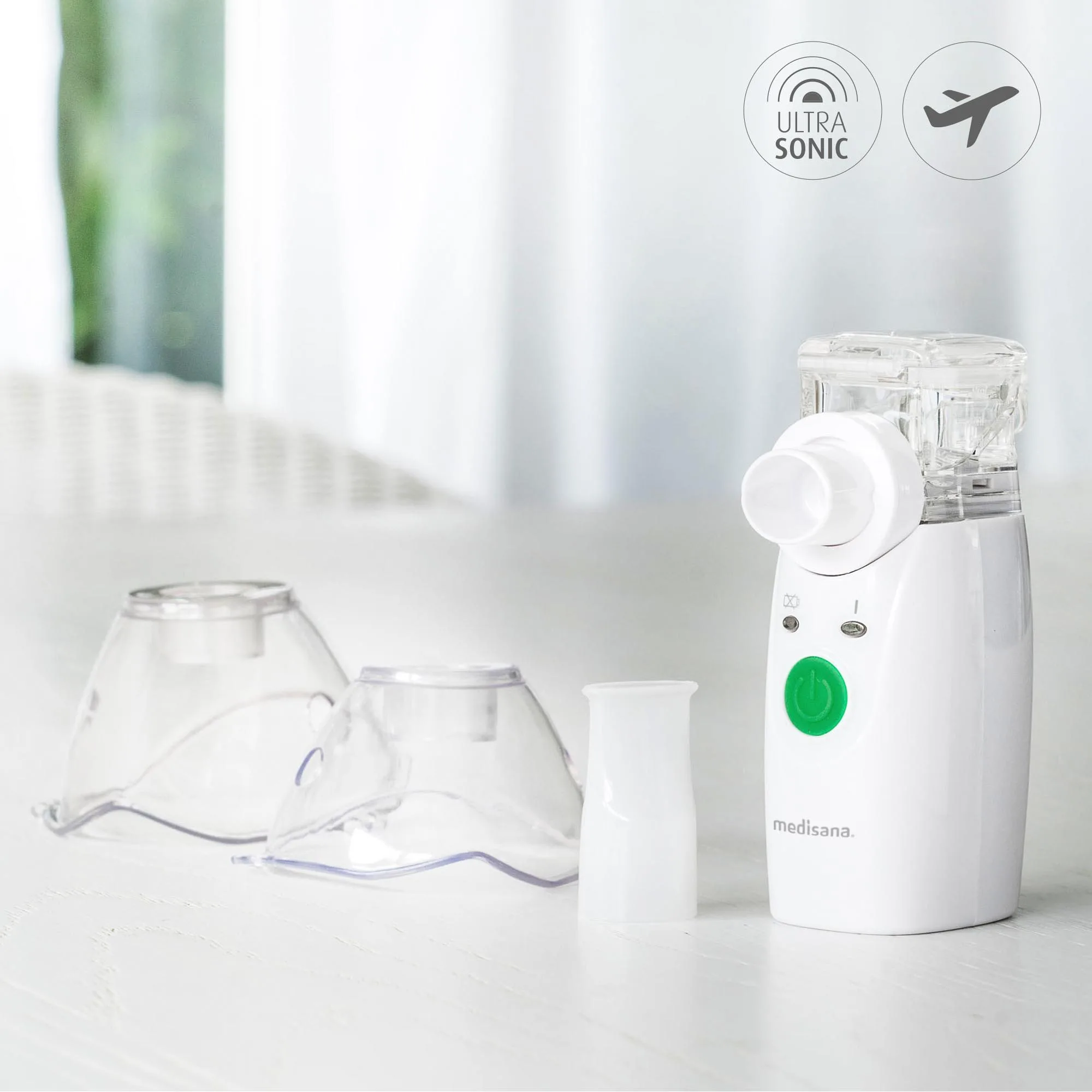 The Medisana IN525 is a modern nebulizer designed for effective treatment of both upper and lower respiratory tract conditions. It uses Vibrating Mesh Technology (VMT) to create an ultra-fine aerosol for highly efficient inhalation therapy. Its compact and quiet design makes it ideal for home use or while traveling. The device is battery-operated, offering freedom from dependence on electrical outlets. It is a certified medical device that comes with a full set of accessories, including adult and child masks, a mouthpiece, and a storage bag for easy transport. The IN525 is perfect for treating conditions such as asthma, bronchitis, and allergies, providing a reliable and easy-to-use solution.
